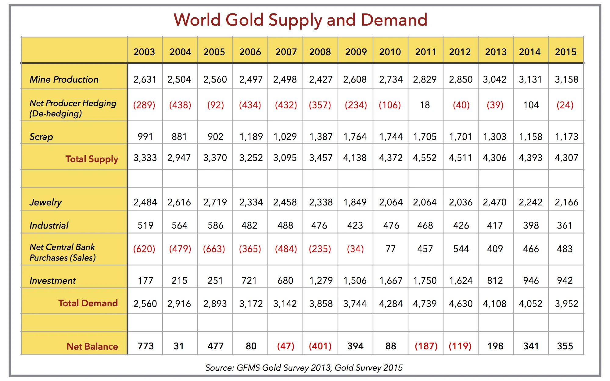 Using data from the GFMS Gold Survey, I calculated that cumulative gold demand over the last 13 years (2003 - 2015) was roughly 48,000 tons. 62% of this demand came from jewelry, 13% from industry (mostly electronics), and 26% came from investment (central banks were net sellers of 1%). However, since the global financial crisis, the demand dynamics have shifted slightly. Since 2009, 51% of the 29,500 tons of gold demand went to jewelry, 10% went to industrial, and 39% went to investment (8% of this was central bank purchases). The following table shows this historical data: