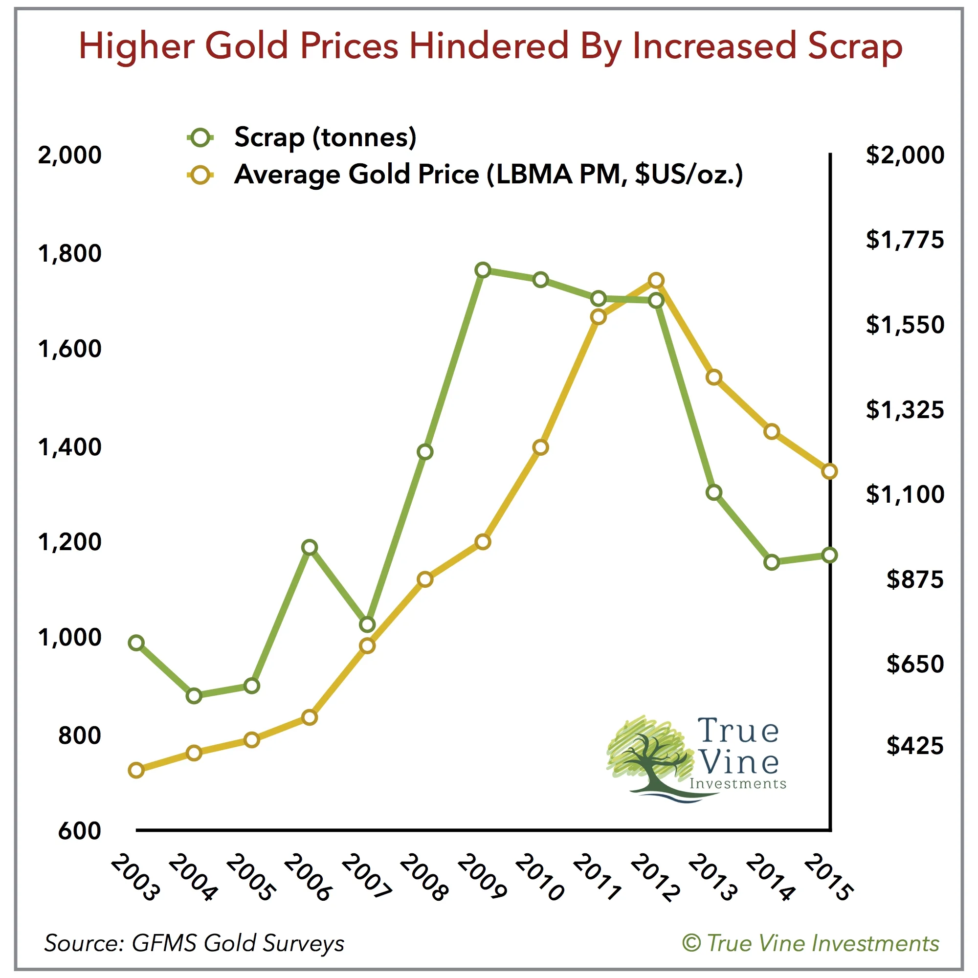Scrap supply has been highly correlated with gold prices. This chart shows how scrap supply rose and fell alongside gold prices over the last 13 years. Increased scrap supplies have acted as a brake on higher prices.