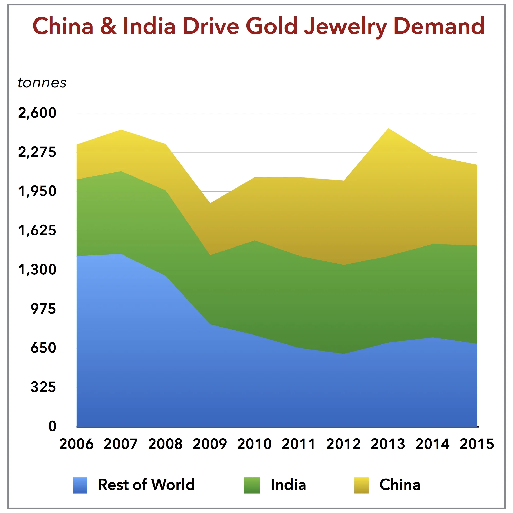 More than 2/3 of global jewelry demand now comes from China and India, as shown on the chart. Despite increasing consumption from China and India, global jewelry demand has not increased over the last ten years. Jewelry demand from the rest of the world has not recovered since the global financial crisis. Higher gold prices and economic malaise have hindered overall demand. Only the increased buying from the now more prosperous Chinese and Indians has held up demand.