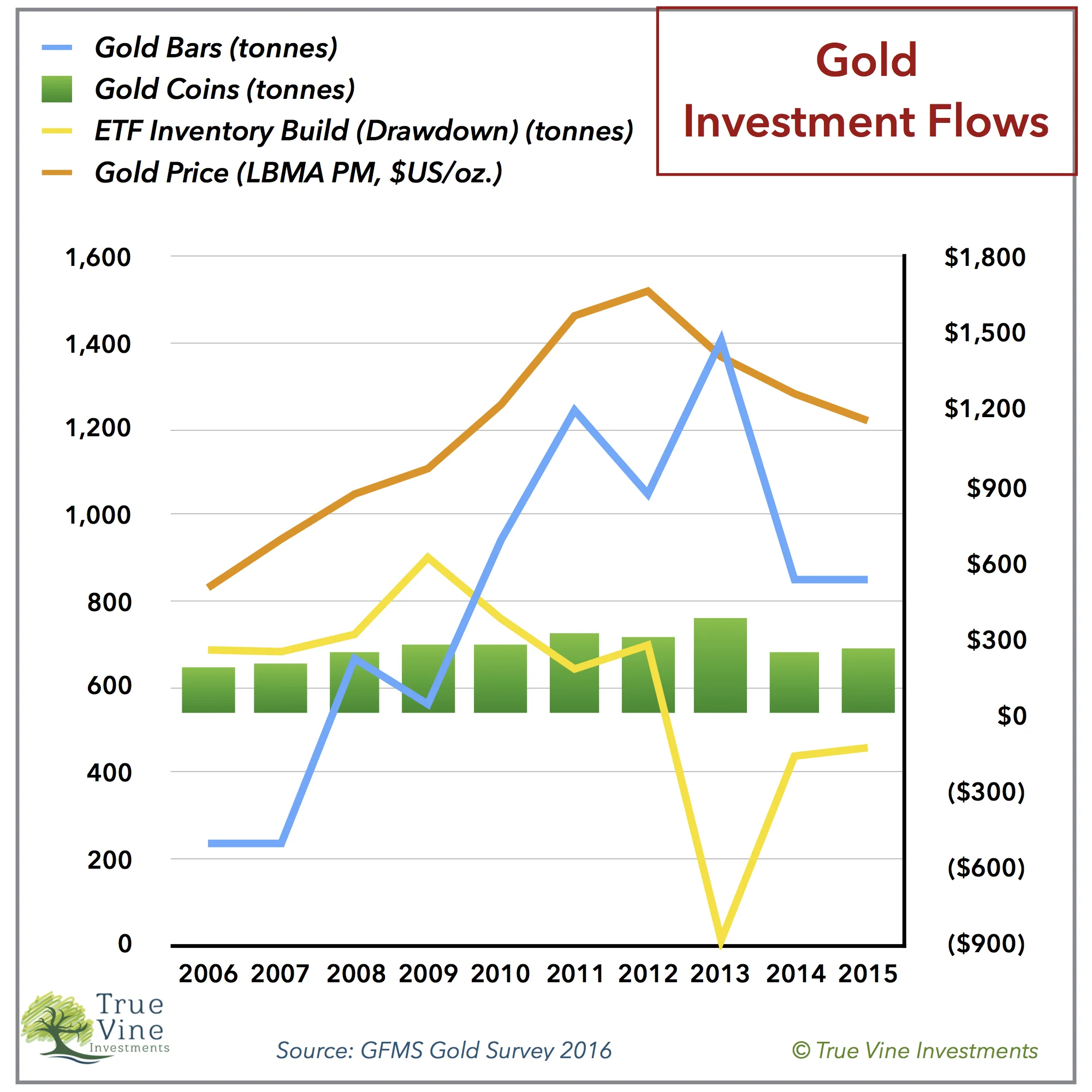 I think the key data point to watch will be purchases of gold bars as these represent the sentiment of deep-pocket, longer term investors who want to safeguard their wealth with physical product. As gold prices continued declining in 2015, purchases of gold bars did not spike like they previously did in 2013. They were exactly the same as in 2014 at 851 tons. As previously mentioned, demand for gold bars continues to fall in 2016.