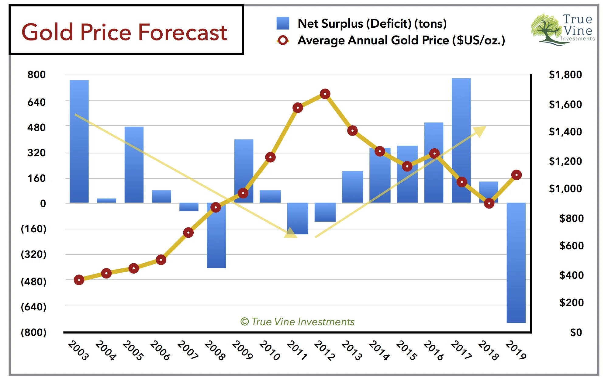 Note in this chart the yellow arrows that I have included to highlight the longer term structural supply & demand trends impacting the price of gold. From 2003 to 2011, the trend was towards increasing supply deficits. From 2012 to 2018, the trend has been and will continue to be a toward increasing supply surpluses. I am forecasting that gold will bottom around 2018, after which this trend will break and a longer term trend toward supply deficits will resume.