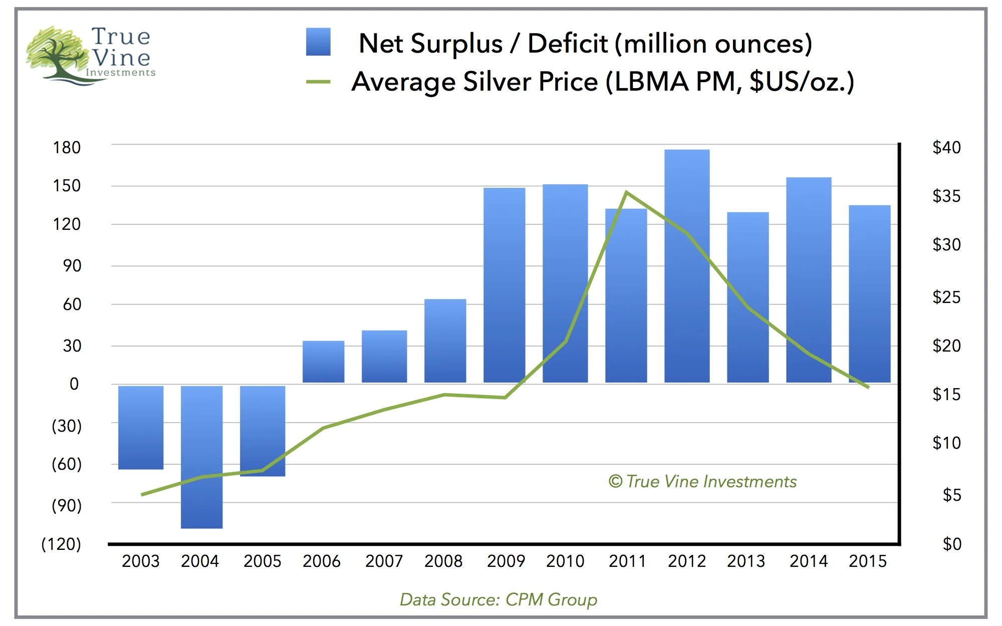 From a pure commodity standpoint (excluding investment), the silver market has been oversupplied for a decade. The following chart shows the annual net surplus or deficit alongside the average annual price: