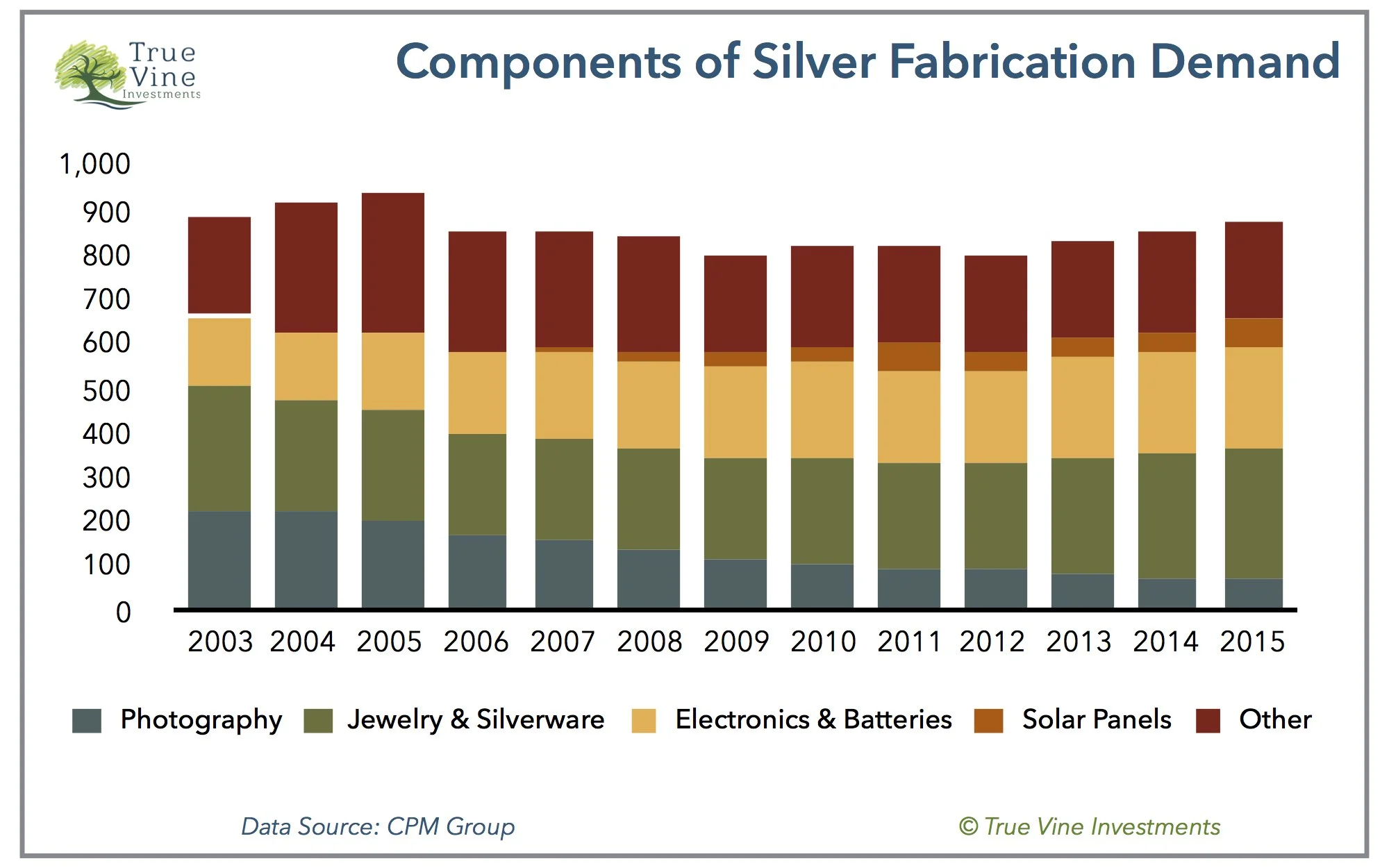 Overall fabrication demand for silver has been relatively level as declining photography demand has been replaced by demand from electronics & batteries and solar panels.